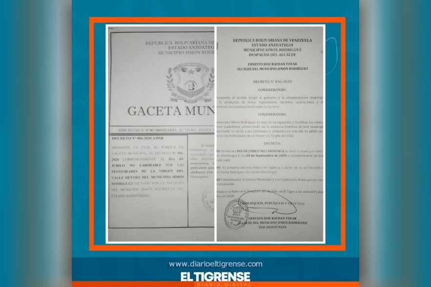 Publicado el07/09/2020 Locales Decretan Día de Júbilo no Laborable este 8 de septiembre por festividades de la Virgen del Valle 07/09/2020 Por Redacción Redacción Virginia SerranoEl Tigre.- Mediante decreto número 006-2020, el Alcalde del municipio Simón Rodríguez, Ernesto Raydan dec... Continuar leyendo