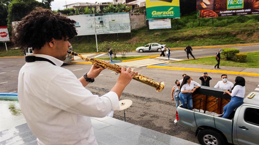 Ahora, acompañado por un trompetista, una cantante, un saxofonista y otro músico, todos abordo de una camioneta, recorren la ciudad para presentar breves recitales que acaparan la atención de vecinos y curiosos.