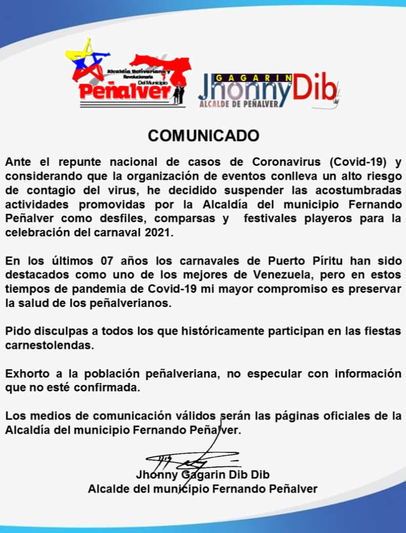 Puerto Píritu.- “Ante el repunte nacional de casos de Coronavirus (Covid-19) y considerando que la organización de eventos conlleva un alto riesgo de contagio del virus, he decidido suspender las acostumbradas actividades promovidas por la alcaldía del municipio Fernando Peñalver como desfiles, comparsas y festivales playeros para la celebración del Carnaval 2021”.
