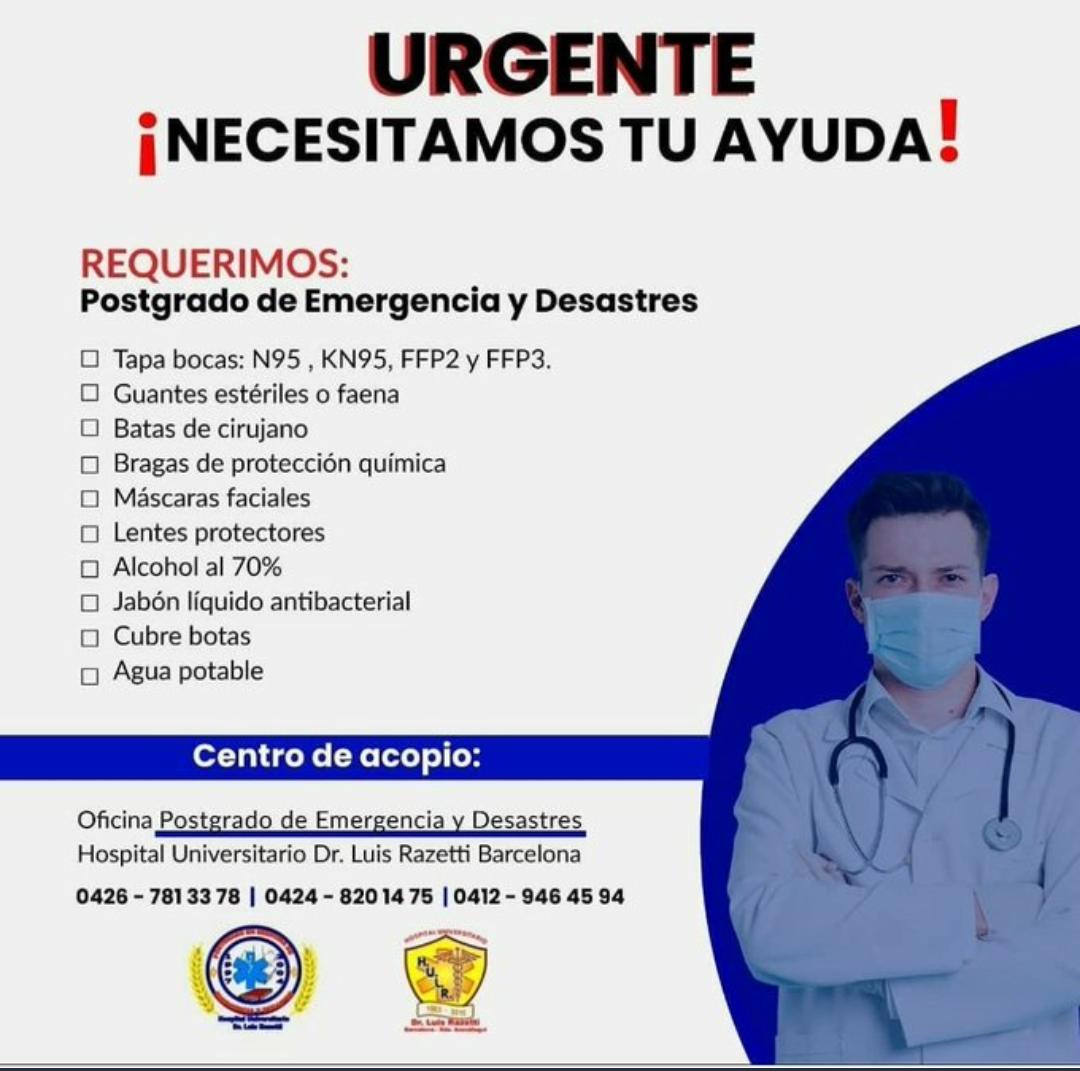 Barcelona.- Médicos del hospital universitario Luis Razetti de Barcelona, iniciaron este sábado 21 de agosto otra campaña por las redes sociales, para la recolección de equipos de protección personal (EPP) para poder laborar.