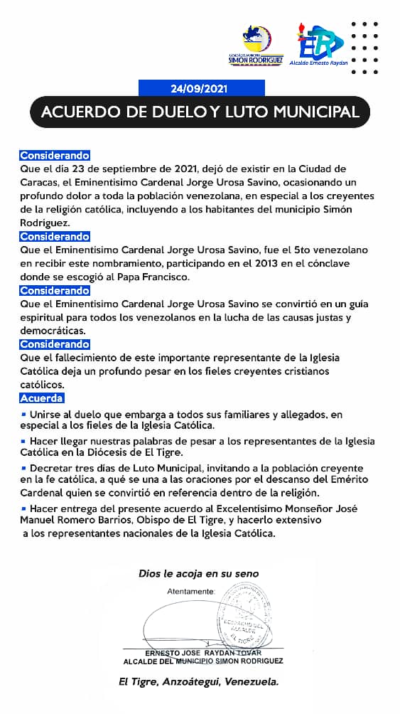 El Tigre.- Luego de conocer el sensible fallecimiento del Eminentísimo Cardenal, Jorge Urosa Savino, el Alcalde de Simón Rodríguez, Ernesto Raydan, emitió un acuerdo de duelo y luto municipal.