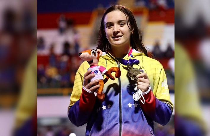 La venezolana gana su tercera medalla en Cali 2021 y sube a la natación a lo más alto del podio