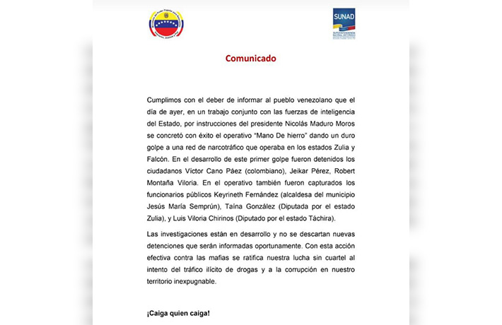 En un comunicado publicado por el ministro de Comunicación, Freddy Ñáñez, se explica que las detenciones resultaron del despliegue del operativo «Mano de Hierro», tras la pista de una red de narcotráfico que operaba en los municipios Zulia y Falcón.