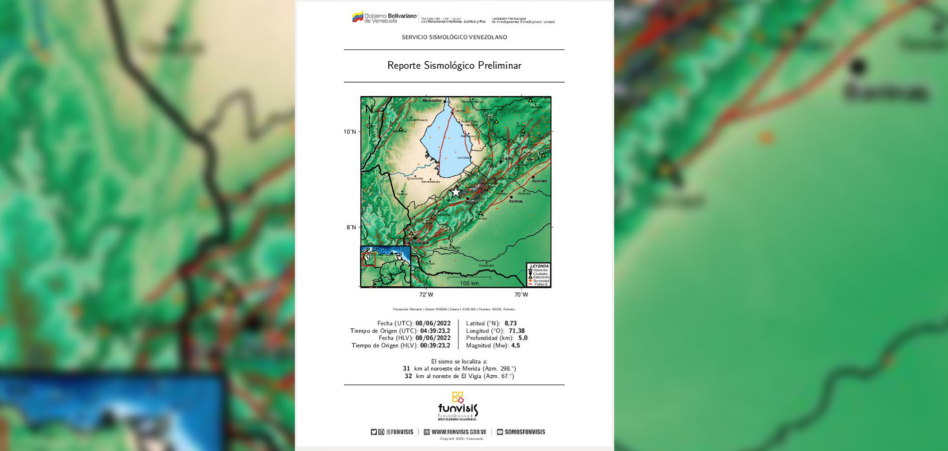 La Fundación Venezolana de Investigaciones Sismológicas (Funvisis), informó que durante la madrugada de este miércoles 8 de junio se registró un sismo de magnitud 4,5 en el estado Mérida, a 24 kilómetros al noroeste de la capital estatal y a una profundidad de cinco kilómetros.
