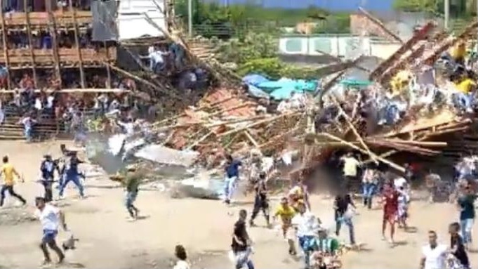 En los videos publicados en las redes sociales, se ve como durante una corraleja -como se conoce a las fiestas populares de toros en Colombia- se desplomó una tribuna de madera que estaba atestada de gente, pese a que no se veía muy sólida.