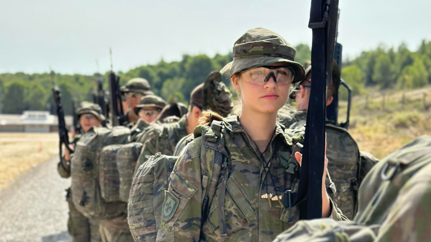 Las imágenes corresponden a unos ejercicios durante su instrucción en la Academia General Militar en la ciudad española de Zaragoza, en sus primeras maniobras con uniforme de camuflaje, casco, la cara pintada y portando un fusil de asalto.