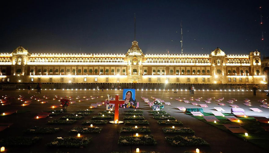 Activistas y familiares de víctimas colocaron cartulinas rosas y veladoras en el Zócalo, donde se ubica el Palacio Nacional, residencia del presidente de México, Andrés Manuel López Obrador, y donde terminará la marcha del viernes.