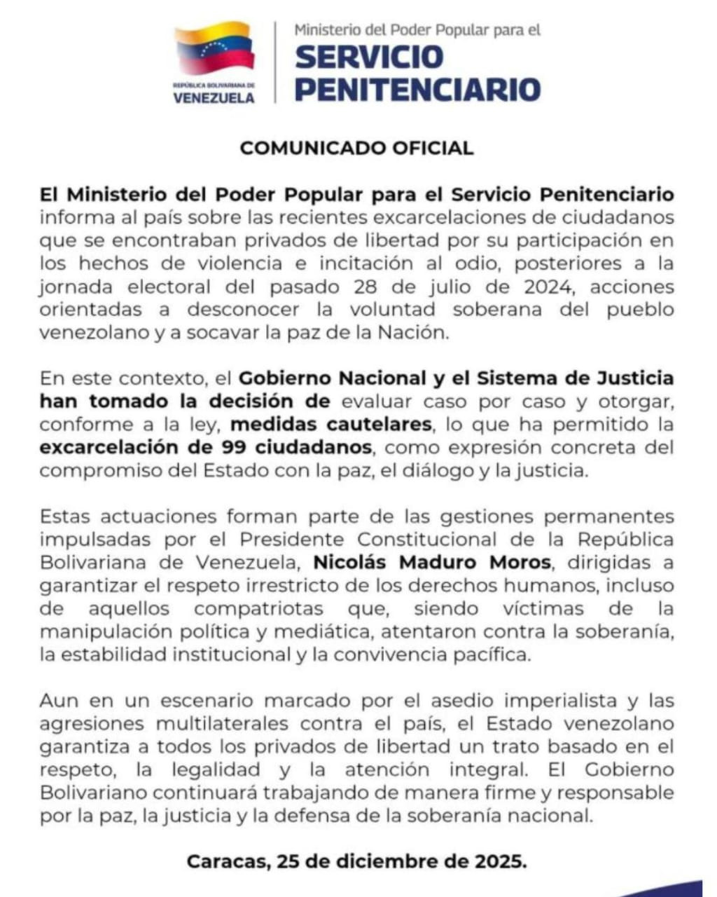 «El Gobierno Nacional y el sistema de Justicia han tomado la decisión de evaluar caso por caso y otorgar, conforme a la ley, medidas cautelares, lo que ha permitido la excarcelación de 99 ciudadanos, como expresión concreta del compromiso del Estado con la paz, el diálogo y la justicia», se asegura en el escrito.