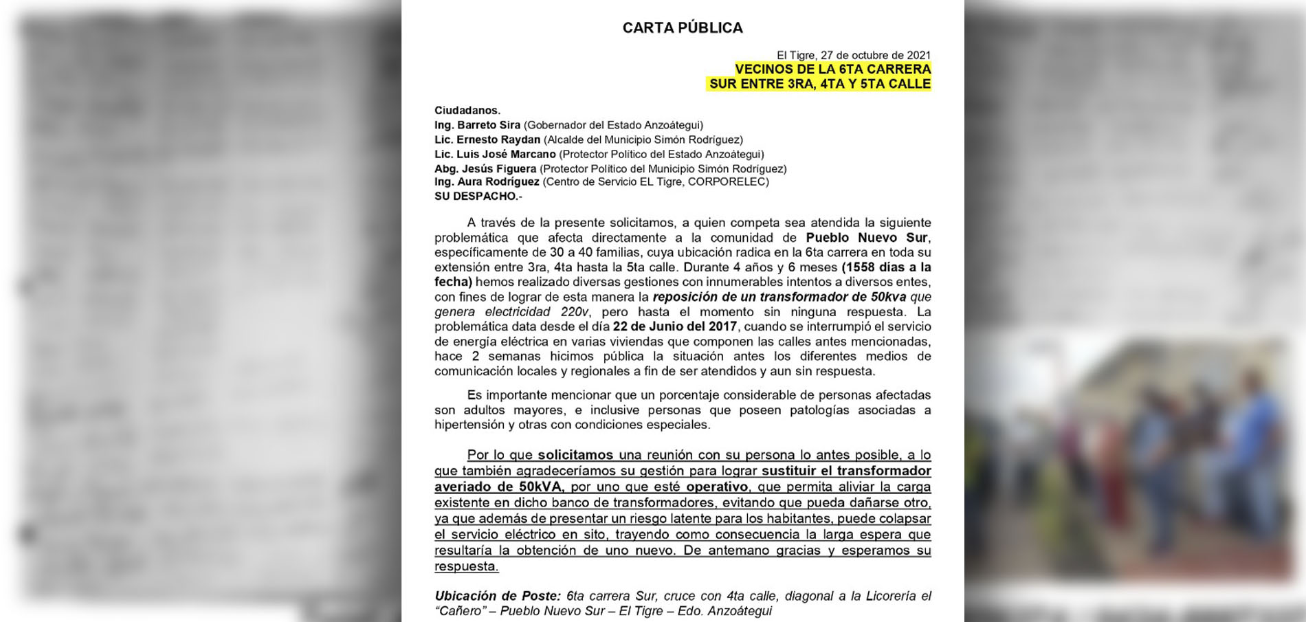 Publicado el28/10/2021 Locales Vecinos de la 6ta carrera Sur envían carta pública a autoridades para exigir un transformador 28/10/2021 Por Marinelid Marcano 0 comments El Tigre.- Cuatro años y seis meses tiene dañado el transformador de 50Kva en modulación 220v de la 6ta carrera Sur, cruce con 3ra, 4ta... Continuar leyendo