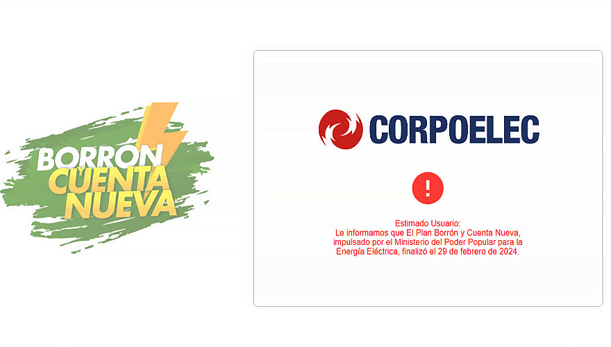 Publicado el31/01/2024 Destacados, Nacionales Corpoelec: plan Borrón y Cuenta Nueva se extiende hasta el 29 de febrero 31/01/2024 Por Redactor Web 0 comments Caracas.- La Corporación Eléctrica Nacional (Corpoelec), informó que el plan "Borrón y Cuenta Nueva" fue extendido hasta el próximo 29 ... Continuar leyendo