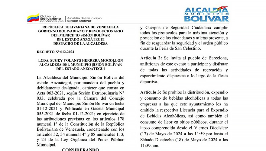 Publicado el16/05/2025 Regionales Alcaldía de Barcelona decreta Ley Seca por la Media Maratón San Celestino 2025 16/05/2025 Por Nota de Prensa 0 comments Barcelona.- La alcaldesa del municipio Simón Bolívar, Sugey Herrera, emitió un decreto mediante el cual se prohíbe la distribución, exp... Continuar leyendo